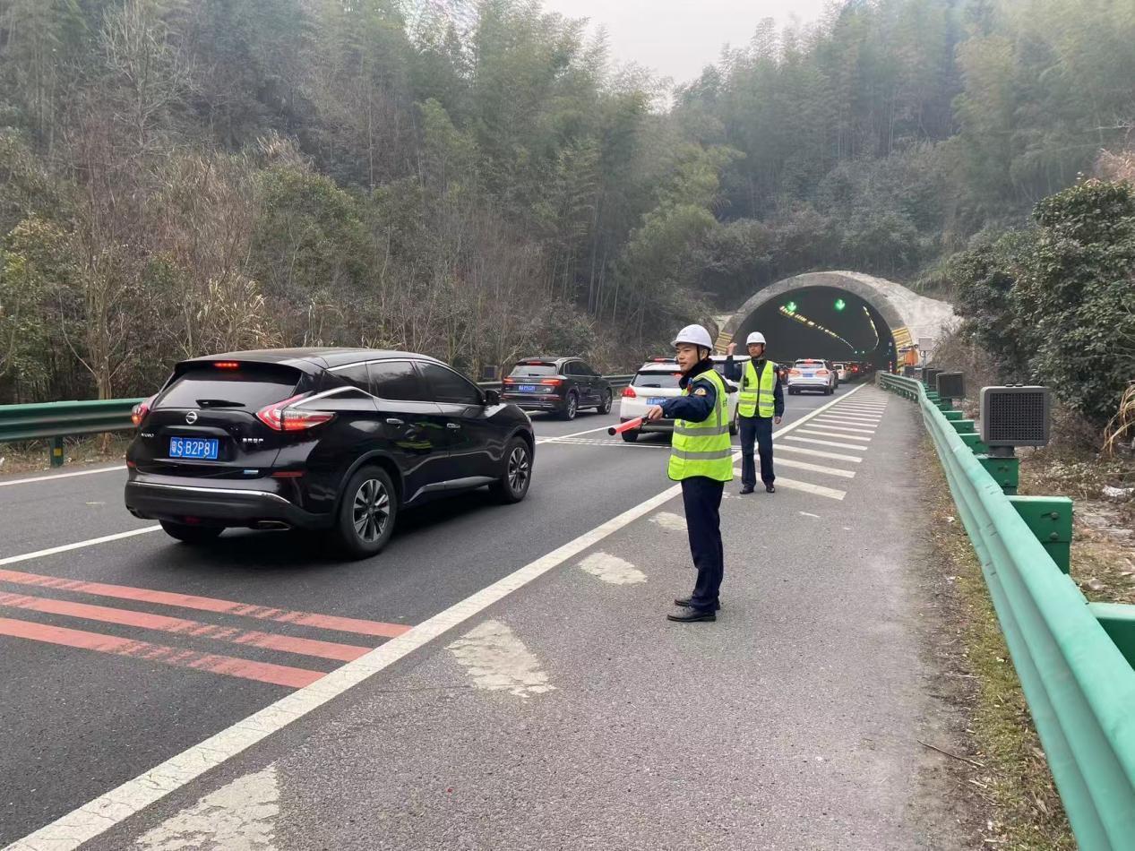 六安北中心工作人员在六武高速梅山湖隧道口疏导车辆。